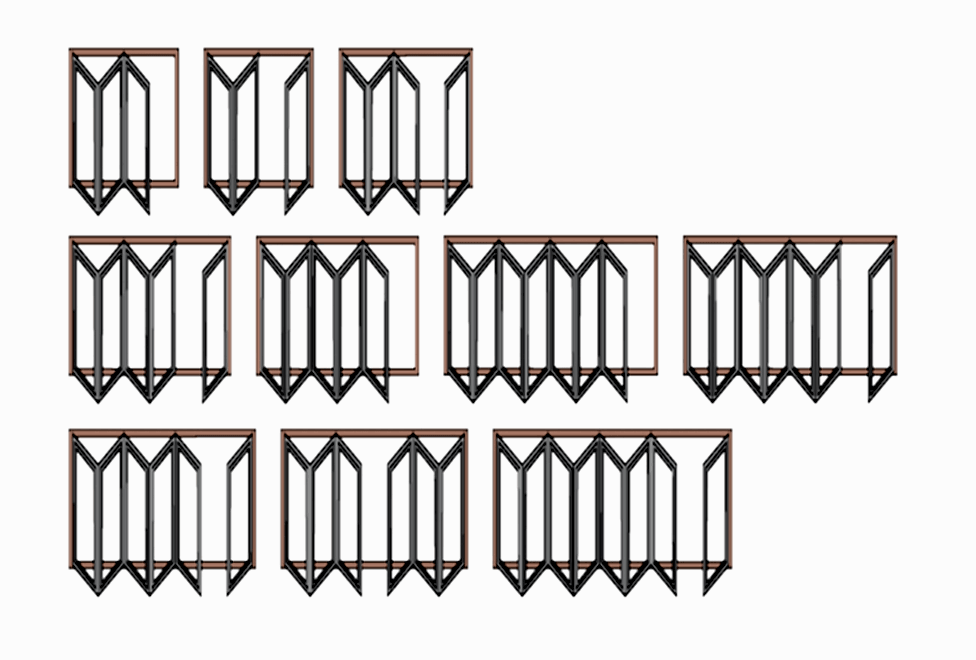 Для удобства открывания конструктивно система дверей «Патио» делится на отдельные группы: группа из складных створок «гармошка» и проходная Pin-Up поворотная (распашная) или поворотно-откидная.