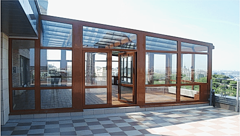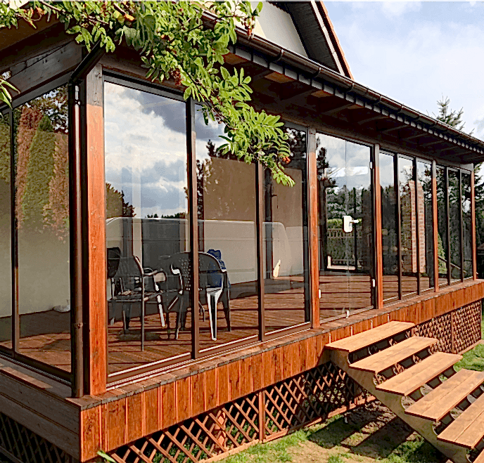 Это удобный вариант, способный выдерживать экстремальные погодные нагрузки и позволяющий обеспечить сохранность мебели в непогоду. Алюминиевые конструкции имеют небольшой вес, поэтому Pin-Up веранды требует дополнительных работ по укреплению фундамента. Кроме того, алюминиевые профили с раздвижным типом открывания - это настоящее украшение фасада. Благодаря широкой гамме цветов и оттенков краски для алюминиевого профиля вы сможете подобрать наиболее подходящий вариант и получить желаемую цветовую комбинацию.