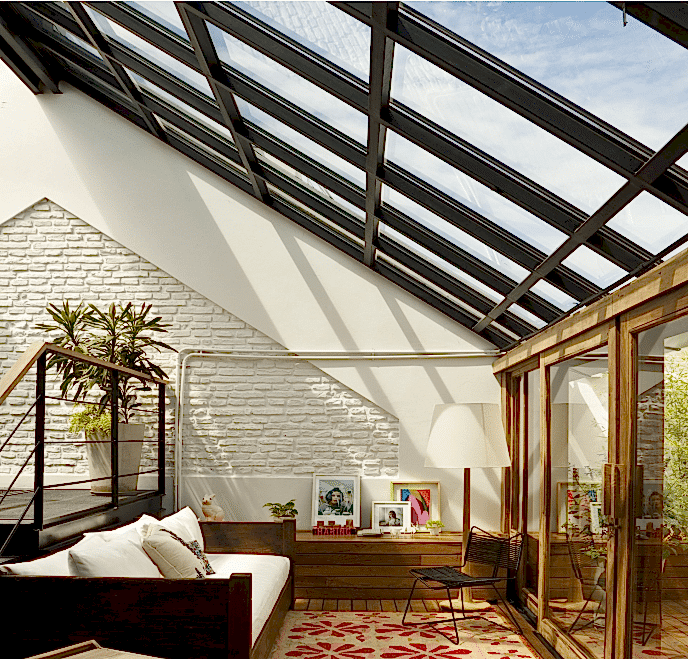 Дом со стеклянной кровлей всегда имеет эстетическую привлекательность. Одна из функций такой крыши - обеспечение дополнительного освещения дома. Практичность и функциональность бесспорно выступают плюсами. Стоит помнить о том, что в теплое время года остекленная крыша в доме сильно нагревается. Необходимо обеспечить изоляцию либо установить сплит-систему. Для того чтобы в зимнее время не скапливался снег, предусмотрена возможность подогрева стекла. Теплая стеклянная крыша - это дополнительные финансовые затраты. Более приемлемый вариант - монтаж крыши под углом минимум 30 градусов для обеспечения самоочистки от осадков.